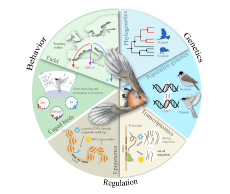 Our research aims at understanding evolutionary history, genetic basis and molecular mechanisms of bird migration behaviour and integrates several fields and disciplines. Specifically, we combine evolutionary genomics (genomes, demography, evolutionary signatures) with cutting-edge behavioural studies (tracking of migratory routes in small songbirds, carefully controlled behavioural experiments) and neurobiological approaches (expression profiling, signalling pathways of focal brain areas at increasing resolution).