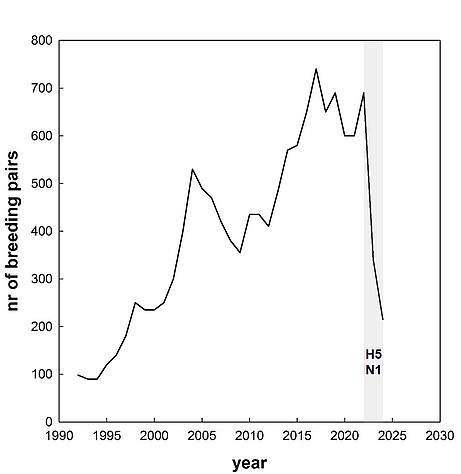 The anthropogenic influence on wildlife hardly knows any boundary. We cause habitat loss and climate change, deplete natural resources and emit pollutants. In addition, we create ideal environments for the emergence of novel pathogens, such as a strain of highly pathogenic avian influenza virus that originated in poultry farming in the 1990s: H5N1. Seabirds are among the birds most affected by these changes and during the breeding seasons of 2022 and 2023 were introduced to unprecedented H5N1 outbreaks at their breeding sites. The long-term study population of common terns at the Banter See suffered immense losses of breeding adults, as well as their chicks, causing a population crash (see figure). Thanks to the long-term nature of our study, including access to archived blood and plasma samples, we are in the perfect position to (i) investigate which factors caused birds at this colony to die of avian influenza (e.g. sex, age, phenology, genetic variation at immunity genes, levels of mercury pollution), as well as (ii) to study the development and maintenance of antibodies against avian influenza.